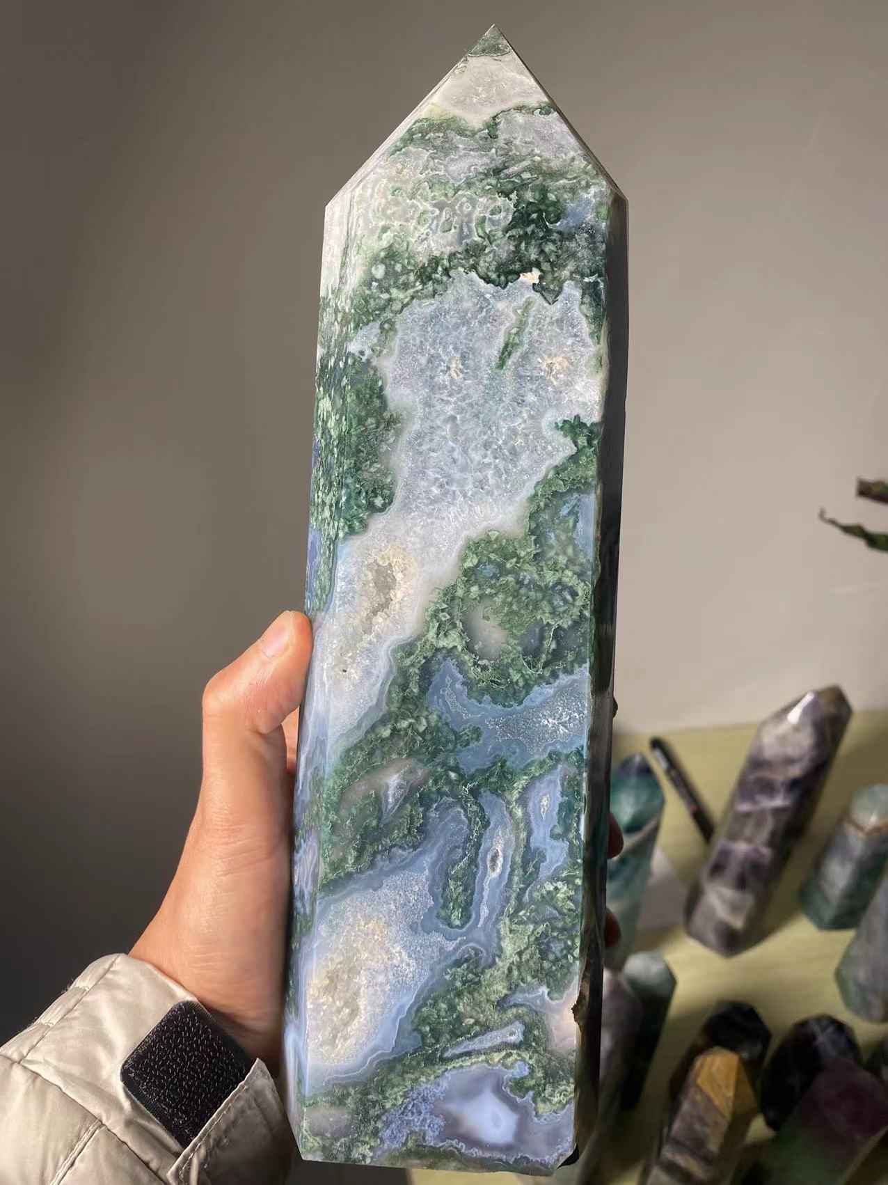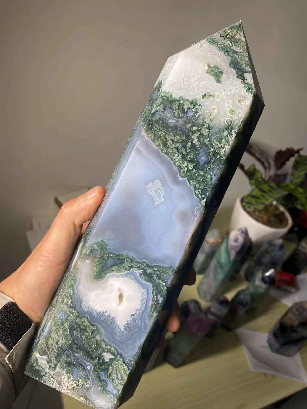 Natural Large Moss Agate Crystal Tower Ornament, a stunning addition to any space. Crafted from genuine moss agate, this piece of stexudes elegance and tranquility,